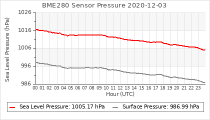 Experimental atmospheric pressure measurement with a simple sensor: BOSCH BME280The instrument is in the data collection box of the CR10X, the temperature and humidity do not reflect the real air conditions, because the box is in the sun and is not properly ventilated for these measurements.