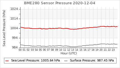 Experimental atmospheric pressure measurement with a simple sensor: BOSCH BME280The instrument is in the data collection box of the CR10X, the temperature and humidity do not reflect the real air conditions, because the box is in the sun and is not properly ventilated for these measurements.