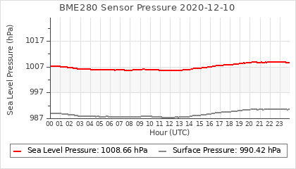 Experimental atmospheric pressure measurement with a simple sensor: BOSCH BME280The instrument is in the data collection box of the CR10X, the temperature and humidity do not reflect the real air conditions, because the box is in the sun and is not properly ventilated for these measurements.
