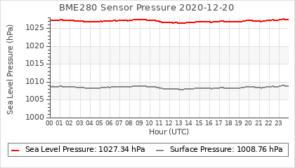 Experimental atmospheric pressure measurement with a simple sensor: BOSCH BME280The instrument is in the data collection box of the CR10X, the temperature and humidity do not reflect the real air conditions, because the box is in the sun and is not properly ventilated for these measurements.