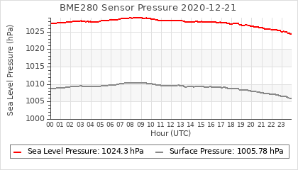 Experimental atmospheric pressure measurement with a simple sensor: BOSCH BME280The instrument is in the data collection box of the CR10X, the temperature and humidity do not reflect the real air conditions, because the box is in the sun and is not properly ventilated for these measurements.
