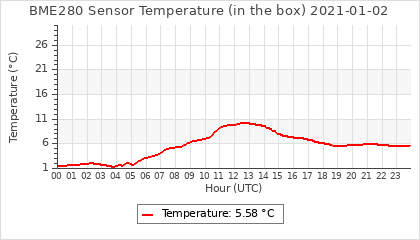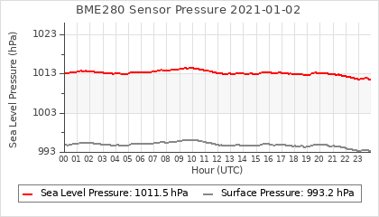 Experimental atmospheric pressure measurement with a simple sensor: BOSCH BME280The instrument is in the data collection box of the CR10X, the temperature and humidity do not reflect the real air conditions, because the box is in the sun and is not properly ventilated for these measurements.