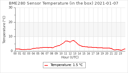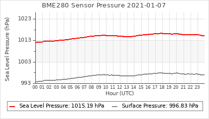 Experimental atmospheric pressure measurement with a simple sensor: BOSCH BME280The instrument is in the data collection box of the CR10X, the temperature and humidity do not reflect the real air conditions, because the box is in the sun and is not properly ventilated for these measurements.