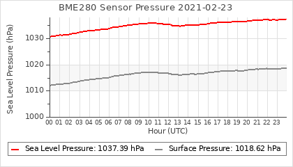 Experimental atmospheric pressure measurement with a simple sensor: BOSCH BME280The instrument is in the data collection box of the CR10X, the temperature and humidity do not reflect the real air conditions, because the box is in the sun and is not properly ventilated for these measurements.