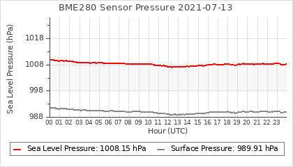 Experimental atmospheric pressure measurement with a simple sensor: BOSCH BME280The instrument is in the data collection box of the CR10X, the temperature and humidity do not reflect the real air conditions, because the box is in the sun and is not properly ventilated for these measurements.