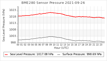 Experimental atmospheric pressure measurement with a simple sensor: BOSCH BME280The instrument is in the data collection box of the CR10X, the temperature and humidity do not reflect the real air conditions, because the box is in the sun and is not properly ventilated for these measurements.