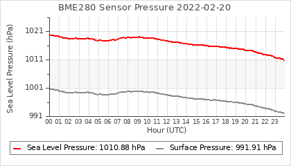 Experimental atmospheric pressure measurement with a simple sensor: BOSCH BME280The instrument is in the data collection box of the CR10X, the temperature and humidity do not reflect the real air conditions, because the box is in the sun and is not properly ventilated for these measurements.