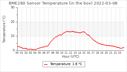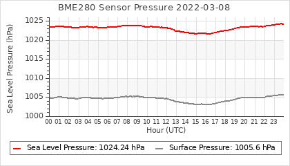 Experimental atmospheric pressure measurement with a simple sensor: BOSCH BME280The instrument is in the data collection box of the CR10X, the temperature and humidity do not reflect the real air conditions, because the box is in the sun and is not properly ventilated for these measurements.