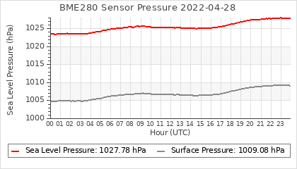 Experimental atmospheric pressure measurement with a simple sensor: BOSCH BME280The instrument is in the data collection box of the CR10X, the temperature and humidity do not reflect the real air conditions, because the box is in the sun and is not properly ventilated for these measurements.