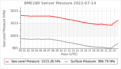 Experimental atmospheric pressure measurement with a simple sensor: BOSCH BME280The instrument is in the data collection box of the CR10X, the temperature and humidity do not reflect the real air conditions, because the box is in the sun and is not properly ventilated for these measurements.