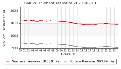 Experimental atmospheric pressure measurement with a simple sensor: BOSCH BME280The instrument is in the data collection box of the CR10X, the temperature and humidity do not reflect the real air conditions, because the box is in the sun and is not properly ventilated for these measurements.
