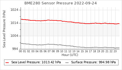 Experimental atmospheric pressure measurement with a simple sensor: BOSCH BME280The instrument is in the data collection box of the CR10X, the temperature and humidity do not reflect the real air conditions, because the box is in the sun and is not properly ventilated for these measurements.