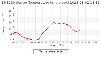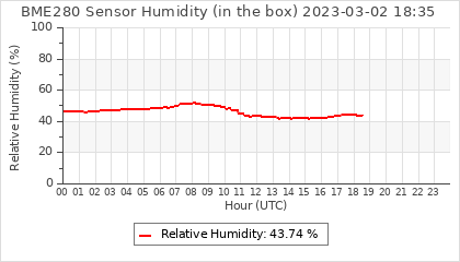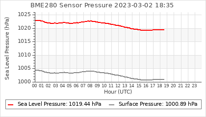 Experimental atmospheric pressure measurement with a simple sensor: BOSCH BME280The instrument is in the data collection box of the CR10X, the temperature and humidity do not reflect the real air conditions, because the box is in the sun and is not properly ventilated for these measurements.