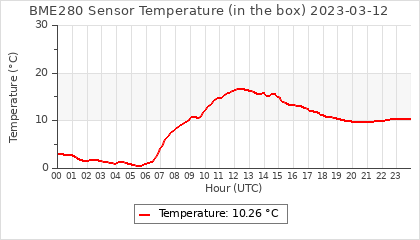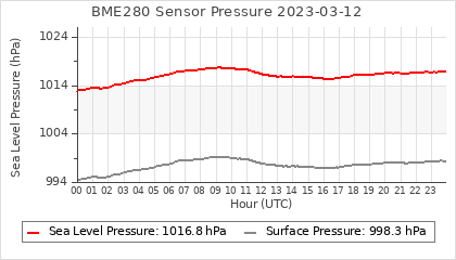 Experimental atmospheric pressure measurement with a simple sensor: BOSCH BME280The instrument is in the data collection box of the CR10X, the temperature and humidity do not reflect the real air conditions, because the box is in the sun and is not properly ventilated for these measurements.