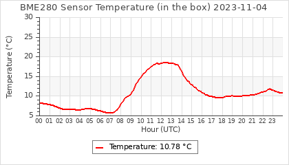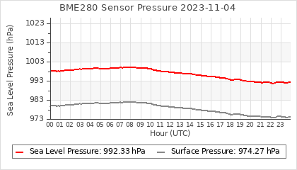 Experimental atmospheric pressure measurement with a simple sensor: BOSCH BME280The instrument is in the data collection box of the CR10X, the temperature and humidity do not reflect the real air conditions, because the box is in the sun and is not properly ventilated for these measurements.