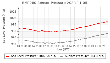 Experimental atmospheric pressure measurement with a simple sensor: BOSCH BME280The instrument is in the data collection box of the CR10X, the temperature and humidity do not reflect the real air conditions, because the box is in the sun and is not properly ventilated for these measurements.