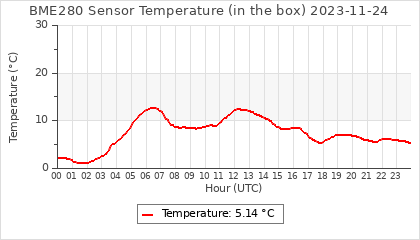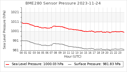 Experimental atmospheric pressure measurement with a simple sensor: BOSCH BME280The instrument is in the data collection box of the CR10X, the temperature and humidity do not reflect the real air conditions, because the box is in the sun and is not properly ventilated for these measurements.