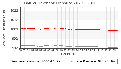 Experimental atmospheric pressure measurement with a simple sensor: BOSCH BME280The instrument is in the data collection box of the CR10X, the temperature and humidity do not reflect the real air conditions, because the box is in the sun and is not properly ventilated for these measurements.
