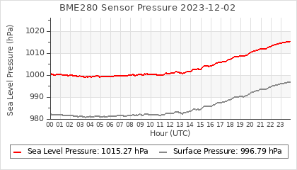 Experimental atmospheric pressure measurement with a simple sensor: BOSCH BME280The instrument is in the data collection box of the CR10X, the temperature and humidity do not reflect the real air conditions, because the box is in the sun and is not properly ventilated for these measurements.