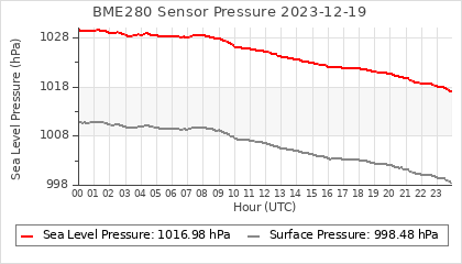Experimental atmospheric pressure measurement with a simple sensor: BOSCH BME280The instrument is in the data collection box of the CR10X, the temperature and humidity do not reflect the real air conditions, because the box is in the sun and is not properly ventilated for these measurements.