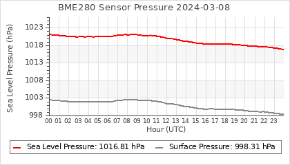Experimental atmospheric pressure measurement with a simple sensor: BOSCH BME280The instrument is in the data collection box of the CR10X, the temperature and humidity do not reflect the real air conditions, because the box is in the sun and is not properly ventilated for these measurements.