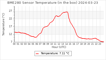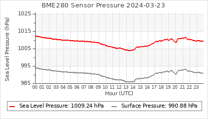 Experimental atmospheric pressure measurement with a simple sensor: BOSCH BME280The instrument is in the data collection box of the CR10X, the temperature and humidity do not reflect the real air conditions, because the box is in the sun and is not properly ventilated for these measurements.