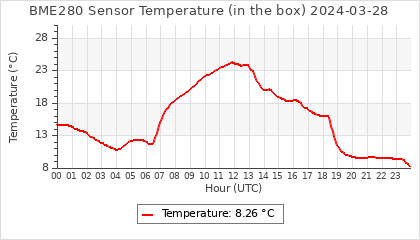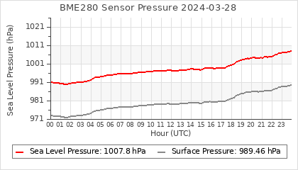 Experimental atmospheric pressure measurement with a simple sensor: BOSCH BME280The instrument is in the data collection box of the CR10X, the temperature and humidity do not reflect the real air conditions, because the box is in the sun and is not properly ventilated for these measurements.